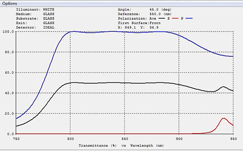 分光棱鏡由一對高精度直角棱鏡膠合而成,在其中一個棱鏡的斜面鍍介質(zhì)膜,在外表面鍍增透膜。